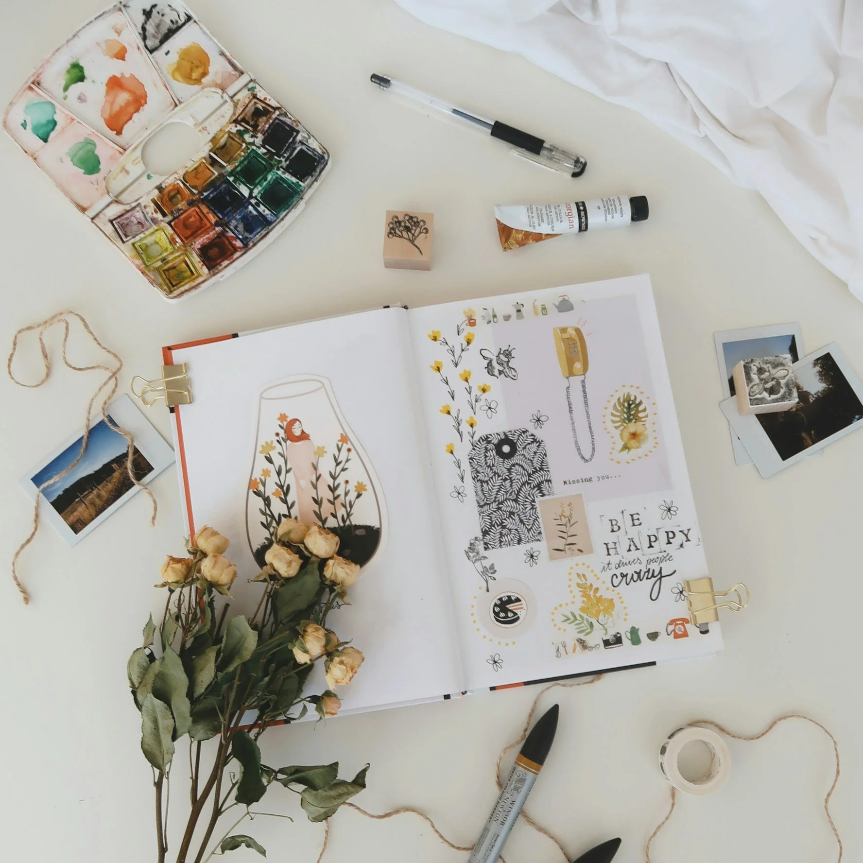 Open sketchbook with floral and travel-themed stickers, drawings, and handwritten notes surrounded by washi tape, pens, Polaroid photos, dried roses, and watercolor paints on a white table.